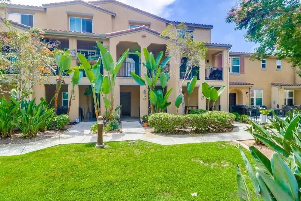 Welcome to this gorgeous 3 bedroom, 3 bathroom townhome with park and greenbelt views nestled in the highly sought-after Legacy Walk Community. As you walk through the entrance, natural light fills the open living area through large windows shining across the room that brings a touch of sophistication to the living and dining areas. This open-concept living area with laminate hardwood flooring and a sliding door leads to a private balcony– perfect for morning coffee, evening gatherings, or simply enjoying San Diego’s year-round sunshine. The kitchen features granite countertops, recessed lighting, and stainless steel appliances with gas cooking. This home offers flexibility with a full bedroom and bathroom on the main floor, plus a laundry closet with newer stacked washer and dryer for easy living. Upstairs, retreat to the spacious primary suite and an additional upstairs bedroom featuring its own attached bathroom. The home includes an attached two-car tandem garage which offers convenience and extra storage.