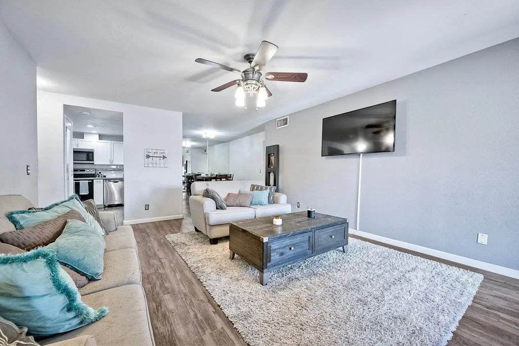 Beautifully updated 2 bedroom, 2 bath unit is move-in ready! Fully remodeled kitchen and updated bathrooms provide stainless steel appliances, quartz counters and designer features including glass pantry door. Wood laminate throughout gives the unit an expansive feel. In unit laundry with full size newer washer and dryer. Great location provides easy access to shopping and freeways.