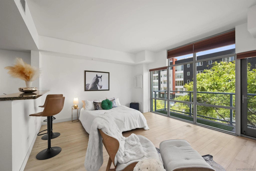 Welcome to Park Terrace in the vibrant Ballpark District of Downtown San Diego. This thoughtfully designed studio features an efficient layout, floor-to-ceiling windows, and a private balcony with bay views. Recent updates include fresh paint, new window treatments, sleek hard-surface flooring, and stainless steel appliances with in-unit washer and dryer. Community amenities include expansive outdoor areas with BBQs, a fitness center, and a large clubhouse. Close to Petco Park, Seaport Village, the Rady Shell, Gaslamp Quarter, and the San Diego Bay.