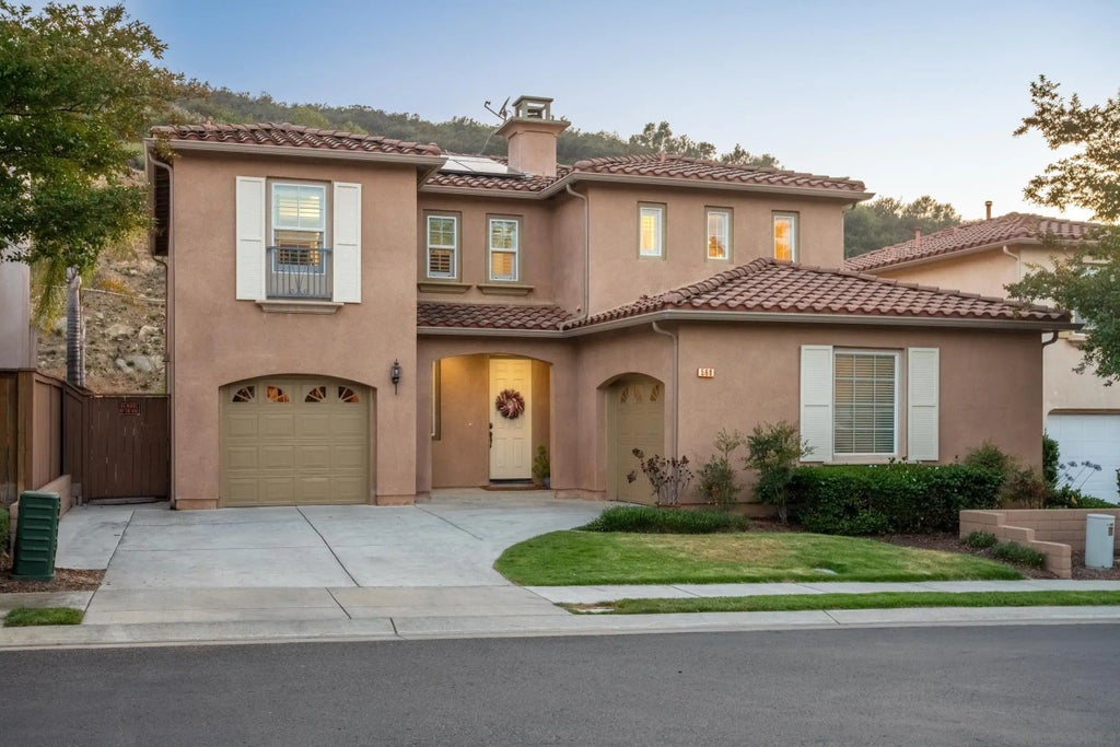 Welcome to this beautifully updated 4-bedroom, 3-bathroom home located in the gated Belleza community—just minutes from North City, Cal State San Marcos, shopping, dining, and miles of scenic trails. Offering 2,358 square feet of thoughtfully designed living space, this move-in-ready home truly has it all. Step inside to an open and airy floor plan bathed in natural light, enhanced by dual-pane windows and solar tubes throughout. The main level features a versatile entry-level bedroom and full bathroom—perfect for guests, a home office, or multigenerational living. Upstairs, the expansive primary suite is a true retreat with a large bedroom, private balcony, oversized walk-in closet, dual sinks, a makeup vanity, soaking tub, and walk-in shower. Enjoy year-round comfort and energy efficiency with leased solar, brand-new wood shutters, and blackout blinds throughout. The stylish kitchen boasts quartz countertops, a gas range, stainless steel appliances, and elegant glass-front cabinetry. Entertain with ease in the formal dining room or unwind in the cozy living room with a gas fireplace and built-in media center. Step outside to your peaceful backyard—complete with serene mountain views and no rear neighbors. Recently restored wood laminate flooring runs throughout the home—no carpet here! An upstairs laundry room offers added convenience, and the low-maintenance backyard pairs perfectly with HOA-maintained front landscaping.