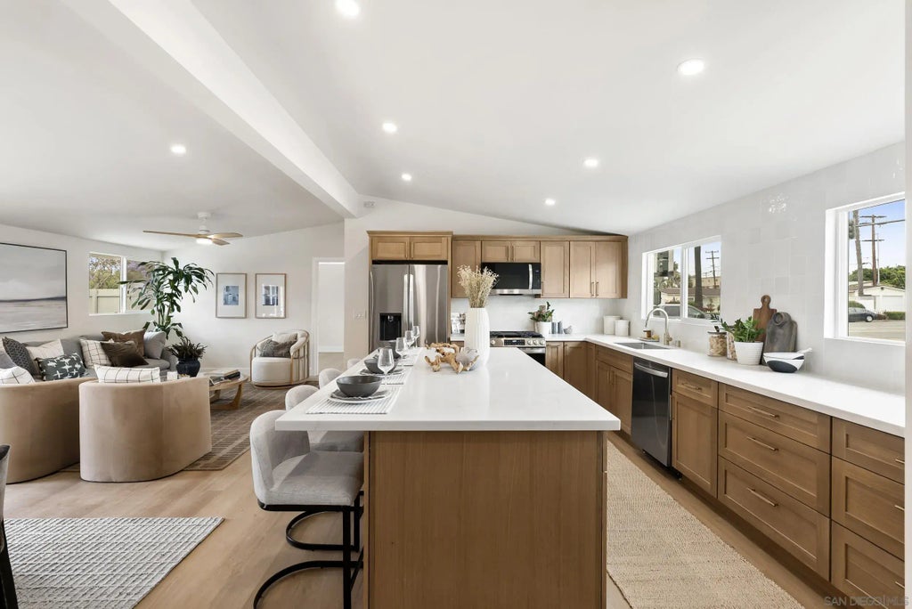 Fully Renovated Clairemont Home with Brand-New Detached ADU! Welcome to this beautifully reimagined 4-bedroom, 3-bath home in a prime North Clairemont location—complete with a brand-new detached studio ADU with full kitchen and bath. Perfect for rental income, multi-generational living, or offsetting that mortgage! Inside the main home, you’ll find an open, sun-filled floor plan featuring new luxury vinyl plank flooring, recessed lighting, dual-pane windows, and a spacious living area. The chef’s kitchen is a true centerpiece with custom oak cabinetry, quartz counters, stainless steel appliances, and a large island ideal for entertaining. The expansive primary suite offers a walk-in closet and spa-inspired en-suite with double vanity and custom tile finishes. The newly built ADU (approx. 280 sq ft) is move-in ready with its own private entrance, sleek kitchen, full bathroom, and stylish finishes—an excellent rental, guest space, or home office. Step outside to your private, fully fenced backyard with new landscaping, space for pets and play, and even room for a pool (rendering online). Additional upgrades include a new roof, updated electrical, and refreshed exterior finishes. Located directly across from North Clairemont Community Park and just minutes from shopping, dining, schools, and freeway access—this property blends lifestyle and investment opportunity seamlessly.