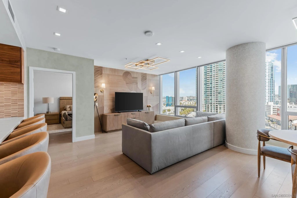 Experience the ultimate in luxury high-rise living at Pacific Gate, San Diego’s iconic waterfront address. Residence 1106 is a stunning 2-bedroom, 2-bath home spanning 1,390 sq. ft., offering an elegant blend of modern design and urban comfort. Expansive glass walls fill the home with natural light, showcasing dynamic city views framed by the downtown skyline. The open-concept living space features sophisticated upgrades like new wall coverings, fresh paint, and stylish lighting enhancements for added comfort and style. A split-bedroom layout ensures privacy and flexibility, while the private covered terrace extends your living area outdoors. The generous primary suite offers an elegant walk-in closet by California Closet Systems and a spa-inspired bath with heated floors, a walk-in shower, a soaking tub, and an anti-fog electric mirror with an integrated 10” TV screen. Automated blinds and a Smart Home system with climate control add convenience throughout the residence. The second bedroom offers flexibility as a home office or guest retreat. Residents enjoy unparalleled resort-style amenities including a private yacht share, luxury car fleet, chef concierge, guest suite, state-of-the-art fitness center with sauna and steam room, residents’ lounge, and an on-site restaurant led by a celebrity chef. Ideally located just steps from the bay, this residence is moments from Seaport Village, the Rady Shell, the new RaDD development, and San Diego’s finest dining, shopping, and entertainment.