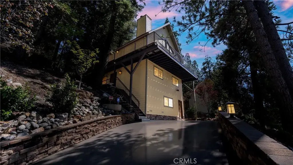 Modern Mountain Retreat with Lake Rights. Located in the exclusive Arrowhead Woods community with full lake rights, this fully furnished A-frame mountain retreat blends contemporary comfort with timeless alpine design. Featuring 3 bedrooms, 3 bathrooms, and a bonus loft, the home offers soaring ceilings, a spacious open-concept living area, and a custom floor to ceiling stone fireplace. The kitchen is appointed with quartz countertops and stainless steel appliances, while a whole home sound system and smart thermostat add a touch of modern luxury. Enjoy sweeping woodland and mountain views from the newer Trex wraparound deck, or host under the stars on the rear terrace, complete with custom lighting, a built-in fire pit, and a jacuzzi pad. Also available for purchase is the sellers double dock with dock cover. Nestled in the deep, calm waters of Lake Arrowheads highly sought-after North Bay. Dock N-482 Slip A. MLS# CV25164424 Whether you're entertaining guests, investing in a vacation rental, or seeking a private year-round escape, this turnkey home delivers on every front. Just minutes from Grass Valley Park, Lake Arrowhead Village, and the country club.