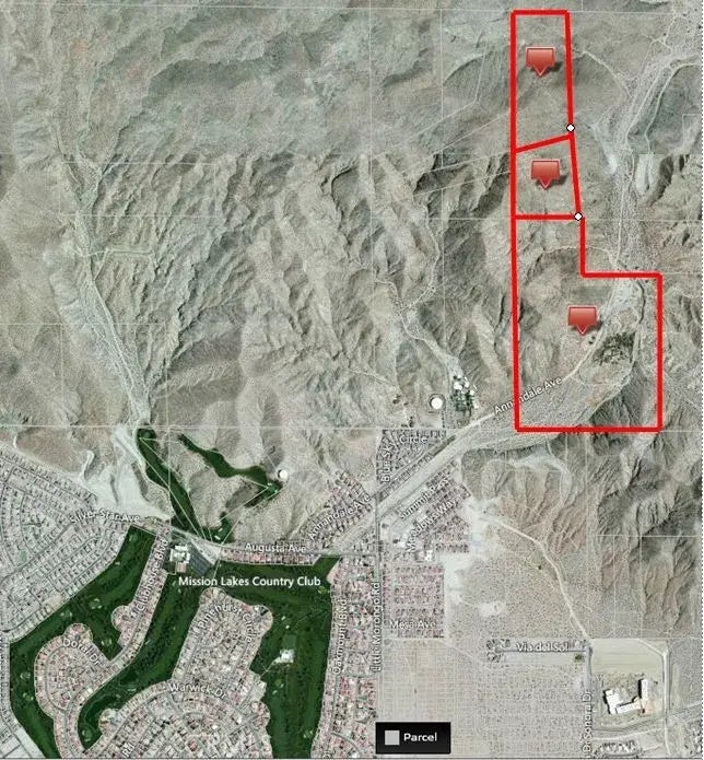 Total of 117.25 acres. APN 671-230-004 is 72.25 acres, APN 671-220-005 is 31.88 acres and APN 671-220-006 is 13.12 acres. The subject property is located on Annandale Road just North of Desert Hot Springs city limits. This location would lend itself to a master planned community consisting of residential and hospitality developments.