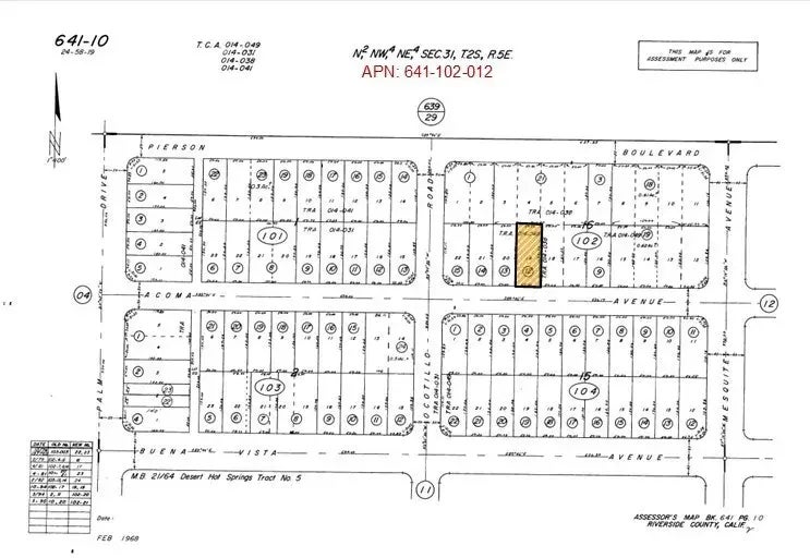 Residential Lot 19, 0.15 Acres (APN: 641-102-012) GPS: 33.96063, -116.49833 Lot 19, 6543 sq ft located in Desert Hot Springs, CA. The city of Desert Hot Springs has designated this property as Mixed Use Neighborhood (MUN). The district is intended to provide local- and neighborhood-supporting mixed-use activity centers with maximum residential densities of 15 dwelling units per acre and/or nonresidential intensity with a maximum floor area ratio (FAR) of 1.0. Commercial retail uses are the primary uses allowed on the ground floor. Professional office and residential uses are also allowed, either integrated with a commercial use or as separate, freestanding use. Easy walkable access from residential neighborhoods and pedestrian orientation are key considerations in the location and site design of mixed-use developments in this zone. According to the planning dept a manufactured home is permitted w/permanent foundation and 2 car garage (HCD compliant and 10 years or newer). DHS Planning Dept also states water and sewer are in the street, overhead power is also on site. Desert Hot Springs, CA, is a great place to call home for those seeking natural beauty and relaxation. Famous for its natural hot springs and breathtaking mountain views, it offers a peaceful, resort-like atmosphere. With affordable housing options, it's a perfect choice for families, retirees, or anyone looking to enjoy the laid-back desert lifestyle. Plus, the community is growing, and its close proximity to Palm Springs means you get the best of both worldsquiet living with easy access to shopping, dining, a