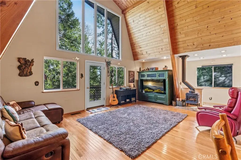 1289 Aleutian is the quintessential Gambrel mountain cabin youd expect when leaving the city life behind for a peaceful weekend getaway. Full lake rights to private Lake Arrowhead and located on a low traffic county paved and maintained road. New owners will appreciate the easy access to this well maintained property. Located on the north side of Lake Arrowhead, perfect for outdoor enthusiasts to enjoy beautiful nature hikes through the Pinnacle rock formation trails just a few miles from this property. A large nearly flat concrete driveway provides ample parking for multiple guests or boat parking! Upon entry, the Gambrel design boats two story vaulted ceilings with a floor to ceiling wall of glass. High quality solid wood flooring blankets the entire main level with knotty pine Tongue and Groove paneling encasing the living room ceiling. The kitchen features stainless appliances, stone tile counter tops, recessed lighting, and ample storage within custom cabinetry. A center island with vegetable sink perfect for meal prep and appetizer display bar top. A full bathroom and full size laundry closet conveniently located on the main level. Upstairs hosts a spacious bedroom and small balcony overlooking the living room. Lower level offers a large bedroom en suite with plenty of closet space and large attached deck. Outside youll find a massive wrap around Trex deck and concrete patio ideal for those who love to BBQ or garden. A/C through central HVAC system and an efficient wood burning stove for maximum comfort. Since owners acquired in 2021, new carpet installed and furnishe