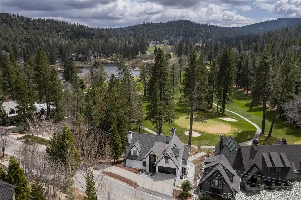 Exquisite luxury meets panoramic serenity at this fully renovated masterpiece, situated prominently on the 6th green of the prestigious Lake Arrowhead Country Club. Set within an exclusive celebrity-owned neighborhood, this residence offers unmatched views of multiple golf holes and picturesque Grass Valley Lake, with captivating vistas from every room. Meticulously redesigned, this home underwent a comprehensive renovation featuring rare and exotic finishes from RH, Arhaus, and Schoenbeck. Step into a formal foyer accented by wide plank hardwood flooring extending across the main level. The open floor plan integrates a sophisticated dining space with a gourmet kitchen, showcasing an oversized marble-topped island, Arabescato marble slab backsplash, Sub-Zero refrigerator, Wolf stove, four Wolf ovens, Cove dishwasher, drawer microwave, and elegant RH hardware. Breathtaking floor-to-ceiling windows illuminate the main living room, crowned by a striking authentic deer antler chandelier, custom cabinetry, and integrated smart home system operated via strategically placed iPads. The adjacent octagonal room offers remarkable golf views, perfect as an office or creative sanctuary. The main-level primary suite is a private retreat with vaulted ceilings, a luxurious stone fireplace, deck access, custom walk-in closet, and an opulent spa-like bathroom featuring heated floors, expansive Kohler-equipped shower, opulent $7,000 bidet toilet, and a custom Opal White Granite illuminated bathtub wall. The expansive weatherproof tile deckover 1,000 sq ftextends seamlessly from the office to
