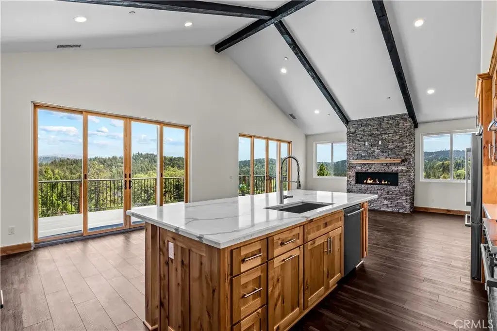 Welcome to your mountain sanctuary! Step inside this newly constructed home and feel all of your troubles melt away. A true escape situated above the golf course with the most breathtaking panoramic views! Amazingly easy access on a maintained road, with lots of level parking & straight into the garage. Once inside you are greeted with vaulted, beamed ceilings & tons of natural light, beautiful LVP flooring & loads of Milgard windows to soak in all of the outdoor beauty. The main level features a spacious living area which adjoins the dining area & open concept kitchen. Huge kitchen island with quartz countertops & stainless appliances, 6 burner Bosch range, built in microwave & walk in pantry! Room for huge dining table along with seating for 6 along the island bar. This is the perfect house for entertaining! Enjoy the floor to ceiling fireplace while gazing out the window & slider surround. The sliding glass doors are Milgard vinyl clad wood which are not only beautiful but functional, offering and extra wide opening out onto the oversized deck. The views are nothing but spectacular all the way from the high desert to Heaps Peak and over to the golf course & country club. Just imagine yourself enjoying those warm summer evenings soaking in the surrounding lights & starlit sky views! The main level also features a bedroom & full bath along with a powder room. Downstairs you will find your very spacious primary suite complete with it's own deck. There is also a spacious bath featuring a soaking tub and walk in shower. There are two other good sized bedrooms on the lower lev