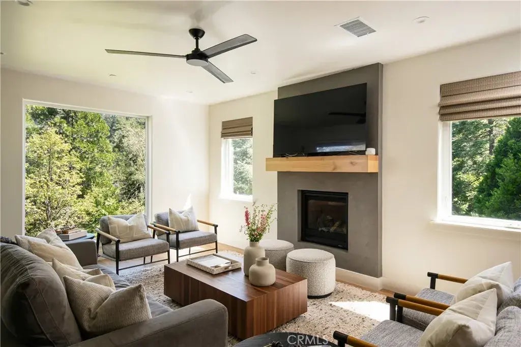 Meet Mittry Lodge, a Custom Mountain Retreat Just Minutes from the Lake! Tucked in one of Lake Arrowheads most charming neighborhoods, Mittry Lodge offers the perfect blend of thoughtful design and relaxed luxury. Just a short walk to the lake and village, the location is ideal for anyone looking to enjoy the mountain lifestyle. Built in 2021 as a high-end vacation rental and second home, every detail was carefully curated to create a true retreat. With level entry, generous parking, and a two-car garage, the home features a rare five bedroom layout across three spacious levels. Step inside to a light filled living room framed by glass and surrounded by pines. The space is centered around a cozy fireplace and flows into the dining area and chefs kitchen, featuring European-style cabinetry, quartz counters, stainless steel appliances, and a large island made for entertaining. Upstairs, youll find three en suite bedrooms, some with peekaboo lake views, along with a furnished deck and a second fireplace. The lower level offers a second living room with a dedicated workspace, two additional bedrooms with a shared bath, and a full laundry room with dual washers and dryers. Each bathroom features quartz countertops, designer fixtures, and spa-style touches. Outdoor living is just as thoughtful, with three fully furnished decks complete with lounge seating, fire pits, dining tables, and a stainless BBQ. The home is also equipped with dual water heaters, air conditioning, and an EV charger. Located just a 10 minute walk from the lake and village, Mittry Lodge is being offered fully