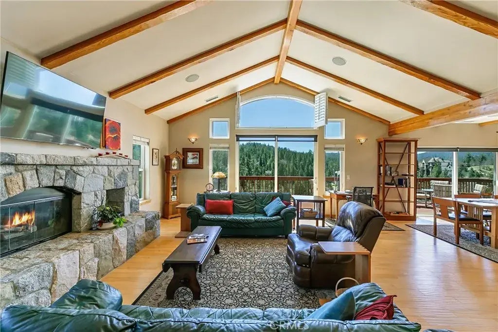 Lake Arrowhead View Lodge Panoramic Views Lake Rights Prime Cul-de-Sac Location... Lake Arrowhead View Lodge a pristine, log-sided mountain retreat with sweeping treetop and ridgeline views, peaceful privacy, and full Lake Rights. Nestled at the end of a quiet cul-de-sac near the Lake Arrowhead Country Club and national forest trails, this immaculately maintained home offers the perfect blend of mountain charm and modern convenience. Enjoy level entry into both the home and the attached, heated two-car garage with epoxy floors and custom built-ins. Step inside to an expansive open-concept living area featuring vaulted ceilings, hardwood floors, floor-to-ceiling windows, and a dramatic split-stone granite fireplaceall oriented to capture the stunning natural views. The chefs kitchen is equally impressive, with granite countertops, knotty alder cabinetry, Viking appliances, center island, and a sunlit dining nook that opens to a large entertainers deck with expansive views. Downstairs, youll find three bedrooms and two full bathrooms, including a luxurious primary suite with its own private deck, spa-inspired bath with dual sinks, a soaking tub, walk-in shower, and an oversized custom walk-in closet with built-in amenities. There is an additional room on this level, currently used as a home office and could be an art studio, or guest room. Other highlights include: Separate laundry room Large unfinished build-up with private access potential ADU, game room, or expanded living space Move-in ready with meticulous care throughout. Whether you're looking for a full-time r