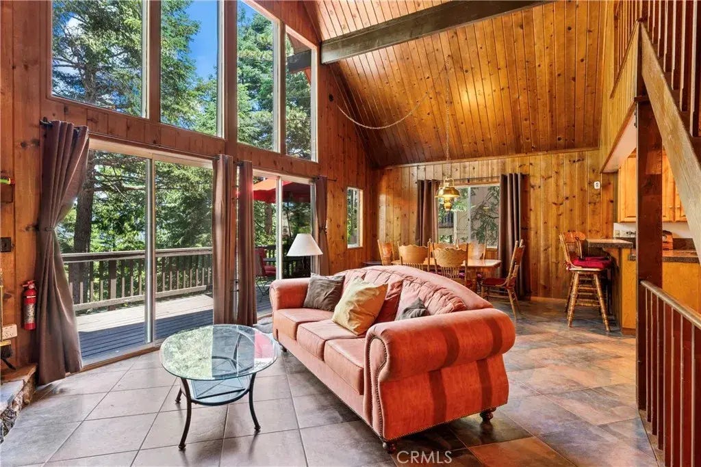 Lake Views from two decks in a Classic Mountain Cabin A-Frame with Lake Rights. Open the front door to where an open floor plan awaits. An expansive two-story Cathedral ceiling roofline opens out to a large deck the full length of the home. Design includes a corner Lava rock fireplace, extra wide sliders, large bank of windows that anchor the living and dining room, extra wide tongue & groove plank paneling combined with great views of Lake Arrowhead and the Lake Arrowhead Village. The kitchen and island/bar are accented in rich, rust brown granite, stainless steel appliances and oversized slate tile flooring throughout. A coveted large bedroom with a huge, full bath is on the first level. Two large bedrooms are located up a floating staircase in a Jack & Jill configuration with a three-quarter bath. Upper level facing Old Toll has tons of windows with dappling sunlight on one side of the home while the other side opens out onto a mezzanine landing that faces the forest view; cozying up the space. One of the bedrooms has an ample sitting area with a great view out a mid-Century triangle shaped window of mountainscapes beyond. The bottom level bonus room/den is appointed with a second corner fireplace, wet bar with sink, island/bar, and enclosed laundry. A second huge deck also has a lake view. A tankless water heater is in finished buildup area with tons of extra storage the whole length of the house. The house has a large two car parking deck, new COPP roof /warranty and alarm system. Additionally, Trex decking under parking platform for firewood and more storage.