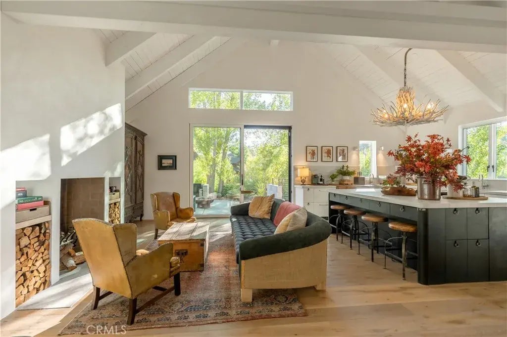 Welcome to 43612 Shasta Road, the crown jewel of Big Bear Lakes highly coveted Moonridge neighborhood. This modern mountain home sits on over one half acre and has been completely and thoughtfully reimagined by one of L.A.s top designers as a personal private retreat. Design of this caliber is a triumph and rarely offered for sale. The beautiful blend of rustic barnwood and sleek contemporary materials make this home Pinterest worthy. The custom steel entry door sets the tone for the elevated design and meticulous attention to detail that awaits within. Luxury finishes are found throughout the home, including white oak floors, hand-plastered walls, and one-of-a-kind lighting. Step into the open living room, dining room, and chef's kitchen with 18 ft beamed ceilings and large masonry wood-burning fireplace. Walls of glass and 10 ft doors seamlessly connect the indoor entertaining area to the aged Ashwood wraparound decks. The well-equipped kitchen features a massive island with a gas range and breakfast bar, as well as two sinks, an antique butcher block, natural stone countertops, and paneled appliances. This home features dual primary suites, one on the entry-level and one upstairs, both featuring en-suite bathrooms and extensive mountain views through large picture windows. An expansive third bedroom, currently used as a bunk room, offers plentiful options for children and guests and has a private en-suite bathroom. An upstairs family room is the ideal space for a home theater or relaxing after a day in the mountains. Located moments from Bear Mountain and stunning nation