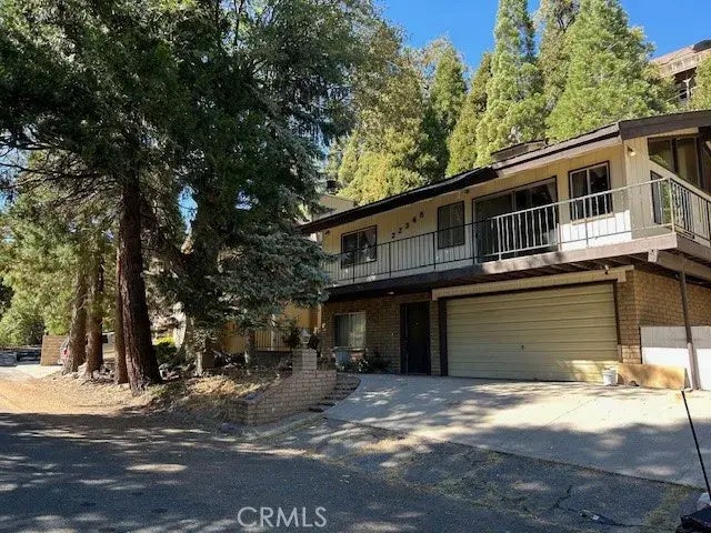 Level entry, tall cathedral wood ceilings, 3 bedrooms and 2 baths, 2-car garage with large workshop plus EXTRA parking. There are two bedrooms on main level with a 3/4 bath; each bedroom has a separate entry, one from front door and one to exterior. Two main bedrooms upper level with full bath. Parking includes two car garage 399 sq.ft. with a full workshop, large laundry room and walk-in pantry closet. There's added parking for RV or boat. Tall knotty pine ceilings on the entire upper floor, including the two main bedrooms and huge living room, spacious kitchen with tons of cabinets and counter space, formal dining area with access to a patio, graced by a floor to ceiling brick fireplace and a front deck that wraps from front to side of house. Rear patio is concrete for your play area. This home gives a sense of 'good bones'. Some work needed, such as new carpet or floor covering, rain gutter and some minor repairs. Price reduction or credits considered. Air conditioning and FAU. Commuter friendly. Just minutes to school, Lake Gregory recreation, fishing and nature hiking. Enjoy your mountain lifestyle with four seasons away from the hassle of city traffic and noise. Neighborhood sits back off the main road for privacy and pleasant surroundings.