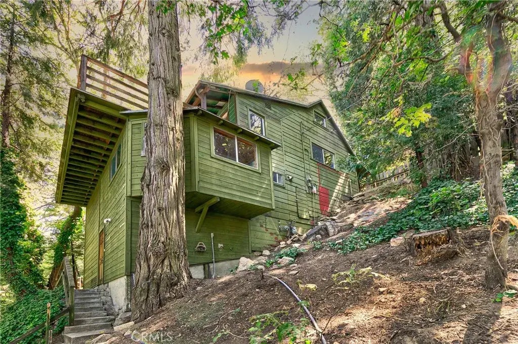 Nestled among the trees with a serene, treehouse-like feel, this true fixer offers endless potential and plenty of space to make it your own. The main level features an bathroom, open-concept kitchen and family room that flows seamlessly into the dining area, with sliding doors leading to a spacious entertaining deck. Downstairs, youll find two bedrooms and a full bathroom, along with abundant storage. The lowest level includes two additional rooms with washer/dryer hookups and a bonus storage room, offering flexibility for hobbies, a workshop, or extra storage space. Adding to its appeal, the property includes three additional lots, ensuring extra privacy along with a slight peekaboo view of the lake. Much of the flooring has already been removed, providing a blank slate for your design vision. With some TLC, this home could truly shine! Great commuter location, conveniently located close to Highway 18, and 5 minutes away from Lake Gregory.