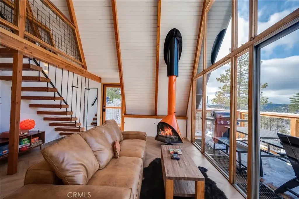 The Lake Arrowhead/Big Bear region is synonymous with A frames. A-frames are reflections of the mountains they inhabit; snowed in, Aprs Ski, and Summer pine aromas. This A Frame sits at a pinnacle, capturing unbridled views. Built in 1964 as a price for a Heinz 57 sweepstakes winner. Then, in 2022, the structure was brilliantly restored showcasing precision in spatial planning, material integrity, and modern-rustic synergy. Herringbone hardwood floors draw the eye across the room like an arrow, up to the full frame windows and out to the sky, boulders, and forest. The kitchen is smart, with a full suite of appliances including retro Classic brand fridge, gas stove and microwave, water filter, dishwasher and hidden laundry facilities. The counters are quartz river stone terrazzo, and an elegant steal reenforced floating waterfall edge serves as a dining setting, bar, prep or laundry station. The sofa is faced directly at the twenty-five-foot-tall window. The forest brushing the bottoms of clouds and shifting colors of the sky and phases of the moon and stars are true natural endless entertainment. A vintage Midcentury MALM fireplace ties a whole architectural theme and scheme together. The bath features a walk- in shower with hexagonal tile Aswell as acoustic paneling behind the commode. The basin sink preserves counterspace. And heated floors warm your bare feet all year long. Downstairs is a bedroom for guests, but the bedroom loft upstairs is romantic magic. Ascend a floating staircase to a boudoir where the moon kisses you good night and the light on the trees brushes yo