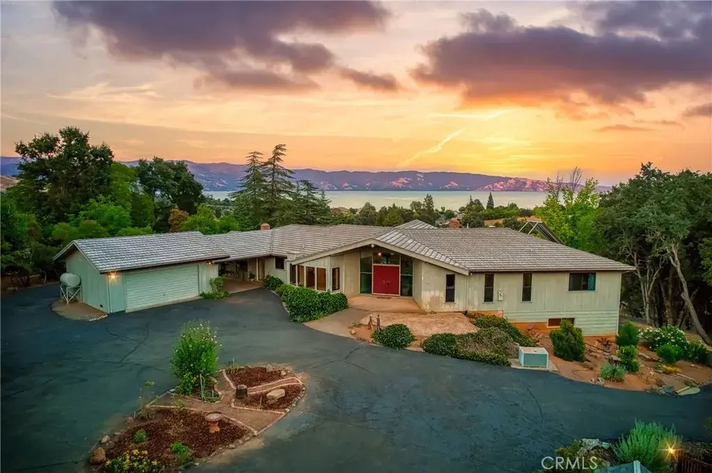 MID-CENTURY MODERN GRAND 4.45 ACRE LAKEVIEW ESTATE For the first time ever on the market, this single-owner, custom generational property features expansive indoor and outdoor spaces, stunning lake and mountain views, all surrounded by orchards and naturally wooded land. Set in a highly desirable location, this private estate is ready for a buyer with the vision and appreciation to restore this manor to its fullest potential. The private drive through the trees brings you to this special place on the hill where the ranch styled layout of the open living spaces harmonize with the natural beauty. The circular drive brings you to the spacious foyer and into the grand living room where the wall of windows captures unrivaled views of the lake & Mount Konocti, and where the beamed ceilings & stone fireplace offer a warm & welcoming vibe. The open layout of the vintage kitchen flows through the spacious family room and into the landscaped patio and pool terraces offering places for enjoying a coffee at sunrise and an evening gathering at the fire circle. The layout is functional for the family yet perfect for entertaining, with four oversized bedrooms and corresponding bathrooms are located down the hall. The house includes a formal dining room, a built-in office area, and a large walk-out basement that includes both a private self contained guest unit and a large high ceiling space perfect for a workshop, game room, or cellar. There are also a variety of exterior places with opportunities to grow a garden, plant a vineyard, raise animals (including horses), and build a second re