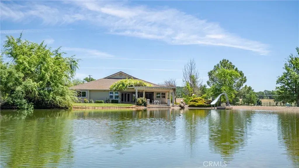 Exceptional & impressive stucco built country home boasts 4 bedrooms and 3 baths on just under 20 flat sprawling acres in beautiful and serene High Valley, Clearlake Oaks. An automated gate for privacy and a wide, well maintained road leads to the property with vast level areas to enjoy. The front porch is substantial with columns and a large concrete patio. As you enter be prepared to be impressed with the soaring ceilings, beautiful real hardwood flooring and calming water views from your own pond. Step into the large inviting living room and next, central in the center of the home we find the spacious kitchen complete with granite counters, fresh stainless steel appliances including a KitchenAid "built-in" fridge/freezer and tons of cabinet space. The kitchen is open to the family room and with easy access to the large covered porch with water and valley views. This is the heart of the home - with space for quiet family dinners or large gatherings with friends and family. Large windows allows for wonderful light and scenery. Thoughtful design elements include a separation between the three ample sized bedrooms and two designer bathrooms on one side of the home, and a delightful primary suite with two walk-in closets, a sitting area and vast bathroom on the opposite end of the home. The Primary suite also has direct access to the inviting back porch. Bringing in groceries is a breeze through the attached garage and there is plenty of storage with a pantry closet and several other extra linen & coat closets throughout. A practical laundry area is interconnected to the kitc