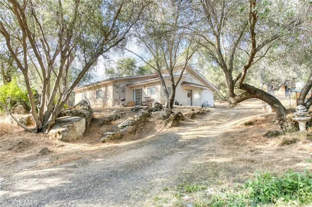 Nestled amidst the breathtaking scenery of rugged foothills of Coaragold, this unique 4-bedroom, 4-bathroom home offers a perfect blend of rustic charm and modern luxury. As you approach the property, a grand entrance framed by lush trees welcomes you, setting the tone for the tranquil elegance that lies within. Recently remodeled with newer flooring. This home has two separate access points and the potential for a second kitchen (plumbing complete). This allows the ability to separate the home into two units each if desired. The over 8 acres of land contains small creeks, extra propane tanks, RV hookups and an extra large metal shop. The possibilites are endless to make this hone your own private oasis.