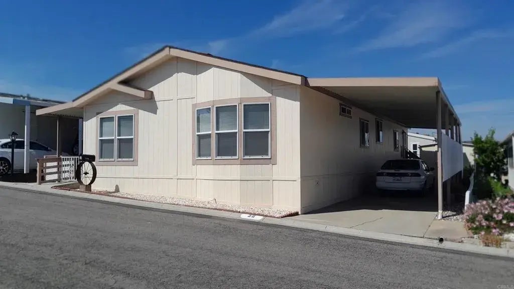 3 Bedroom 2 Bath plus office/den! Located in the desirable community of San Marcos Views, this home offers no space rent and NO AGE RESTRICTIONS, YOU OWN THE LAND! This open floor plan features vaulted ceilings throughout. Kitchen highlights a center island and eat-in dining area. Separate laundry room off kitchen. Laminate plank flooring throughout the common areas and bedrooms, central furnace and AC unit. The primary bedroom features an ensuite bathroom w/dual sinks and soaking tub. Recently painted interior walls and exterior doors. There is a roomy carport for parking 2 cars, possibly 3! Low maintenance yard with landscaping rocks and producing lemon tree. Large Storage unit located off carport with shelves. Amenities include common area maintenance, community pool, recreation room, community laundry rooms throughout the park and plenty of guest parking. Centrally located w/easy access to hwy 78 & I 15 freeway.