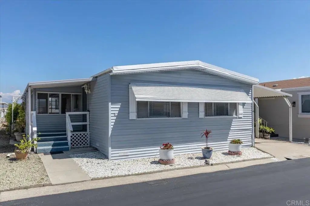 2 bedroom / 2 bathroom home with an open floor plan and new flooring throughout. Most appliances are new aswell! Separate Living and Family room areas connected by a Formal Dining room with built in hutch. The Kitchen has an island dining bar. Skylight. Walk in closets in BOTH bedrooms. The backyard is fencedand features turf, a fruit tree, a very private covered patio and storage shed. The enclosed porch is not included in the square footage but provides additional usable space for hobbies, an office, storage, etc. Rancho Vallecitos is a beautiful, 5-Star, resort style community for persons 55 years of age and over (2nd resident can be age 45+). One of the most beautiful manufactured home communities in California, Rancho Vallecitos has great views that can be enjoyed throughout the community, plus many social activities and amenities. Amenities include a clubhouse/recreation building, pool & spa, library, gym, billiards room, card tables, game and craft room, putting green, dog park, RV parking for an additional cost, and so much more! Monthly space rent is $698.31and park is under city rent control.