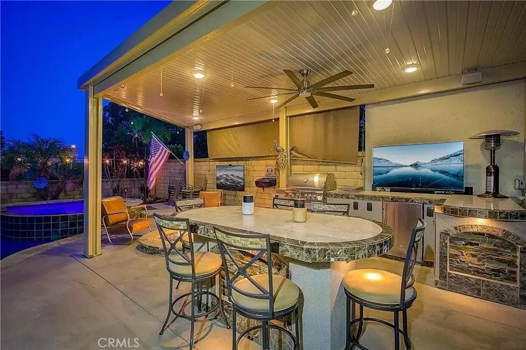 Rare Sterling Heights pool home that resides on the community perimeter allowing for privacy and views as well as gentle breezes. This home was recently remodeled with a stunning kitchen including all new cabinetry, quartz counter tops, full wall glass tile backsplash and stainless appliances. Dont miss the high-tech refrigerator. All three bathrooms were also remodeled with new cabinets, counters, sinks and toilets. The primary bath has double vanities and a stunning shower. Plantation shutters accent the glass sliding doors to the exterior. The living room features vaulted ceilings and a refreshed smooth concrete modern fireplace. Enjoy true California living in your beautiful rear yard. The pool was installed about 9 years ago and features flagstone coping, pebble tech surface and a built-in hot tub. The pool is gas heated but also has a rooftop solar heating option. Entertain in your covered outdoor kitchen with BBQ, refrigerator, and island seating for 6. This area is wired for TV, LED lighting and speakers. Youll enjoy the sit-down firepit as well. Even though you have central air, nearly every room, and the outdoor kitchen, have ceiling fans. Dont let this one get away!