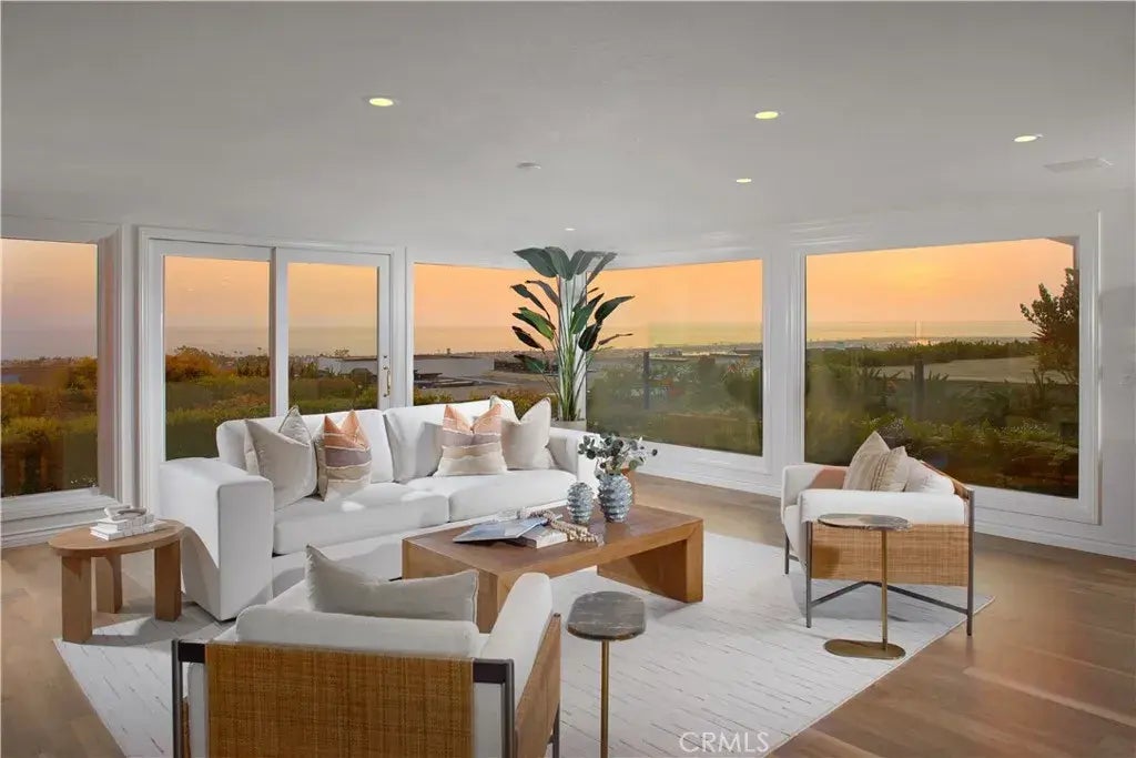 Live life as it is meant to be at this impeccably maintained and upgraded home in Corona del Mars desirable Harbor View Hills community. An expansive elevated homesite welcomes panoramic Pacific Ocean, city-light, Catalina Island and sunset views that also encompass the fairways of Pelican Hill and Newport Beachs pier and harbor. Private and sophisticated, the single-level residence greets guests with a generously sized entry courtyard accented by a tranquil fountain. Double doors open to immediate ocean views that are framed by floor-to-ceiling windows in the living room and a separate den with built-in cabinetry. Leading to a view-enriched terrace, the living room shares a see-through fireplace with a dining room that offers garden vistas. The kitchen shines with Calacatta quartz countertops and full backsplash, stainless steel appliances, courtyard access, a garden window, peninsula, and white cabinetry with a built-in pantry. An open office is located just beyond the kitchen and features a built-in desk and cabinetry. Bright natural lighting accentuates the open design of the home, which extends approximately 3,173 square feet and hosts three bedrooms and three-and-one-half baths, including a casita with separate entrance off the courtyard and a vaulted ceiling. The secondary bedroom is impressively sized and boasts ocean views and a walk-in closet, while the primary suite opens to the view terrace through an elegant retreat and is distinguished by a garden-view shower, two sinks and ample wardrobe space. A 400-bottle wine cooler and epoxy flooring awaits in the attache