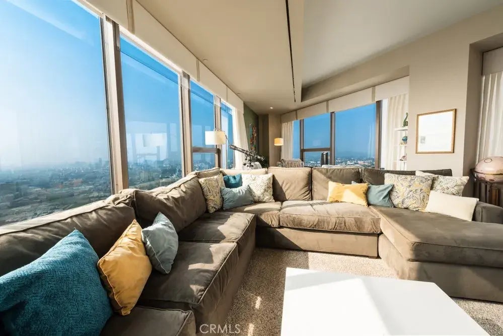 This beautifully-renovated unit is decorated by renowned interior decorator Darci Goodman, this exquisite corner unit epitomizes sophisticated urban living. Boasting designer touches at every turn, this impressive residence in Downtown LA's premier high-rise offers breathtaking panoramic views spanning 270 degrees, from the city skyline to the iconic Hollywood sign and beyond to Santa Monica. Hosting guests is a delight in this impeccably designed space, featuring custom window treatments, designer wall finishes, and a cutting-edge sound and audio-visual system. There is an in-unit laundry and residents also enjoy access to resort-style amenities, including a spectacular 17th-floor SkyDeck complete with a heated infinity pool, spa, cabanas, and lounge beds, alongside a wet bar, BBQ grill, and fire pit cove. Additional perks include a fitness center, conference room, theater/media room, 24-hour attended lobby, ample guest parking, and two designated parking spaces. Situated in close proximity to top-notch dining, the financial district, Staples Center, LA Live, and other major attractions like 7th at Fig and The BLOC, this is urban living at its finest. Any numerical statements regarding square footage, room dimensions, and/or lot size are approximations only and have not been verified by the Seller or Broker. Broker & brokers agents do not represent or guarantee the accuracy of the lot size/dimensions, permits, or other info concerning the conditions or features of the property. The buyer is advised to investigate the condition and suitability of all aspects of the property