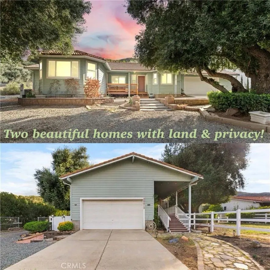 Lovely Los Olivos Estates, California Ranch Home with; two on a lot, single level, multifamily, income producing, horse property, and is an excellent investment property. Both homes have recently been updated, remodeled and have new plumbing. Front home is 5 bedrooms and 2 bathrooms. Second home is 2 bedrooms and 2 bathrooms that is nestled at the base of the Cleveland National Forest. Both homes have large wood decks, mountain sunrise views, and surrounded by mature olive trees. Direct access to wide two car garages, with workshop. Room for recreational vehicles, add an Airstream for additional rental income. Accessible on both sides of property on fully usable flat lot. Private quaint front porch with views of beautiful rolling mountains. Located close to Temecula Wine Country, local schools, parks, lakes, shopping, dining, entertainment, golf courses, and Pechanga Resort.