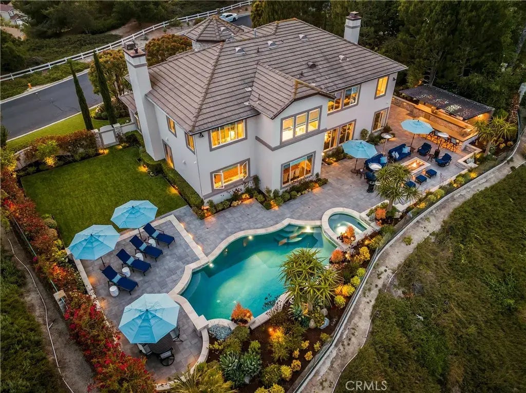 Discover luxury living in the highly-desired Pinnacle neighborhood of Coto de Caza. 32 Panorama showcases unparalleled panoramic views of Saddleback Mountain and the Coto de Caza Valley from almost every room in this beautiful estate. The backyard presents an entertainer's paradise, offering a completely redesigned front and backyard featuring a sparkling pool and spa, outdoor bar with custom cantilevered roof, massive architectural fire pit, surround sound, frameless glass fence for unobstructed views, extensive lighting, large lawn with room for a pickle ball court and stunning views. The completely remodeled interior showcases impeccable design at every turn. With 4 bedrooms including a main level guest suite, dedicated office, craft room (could be converted back to 5th bedroom), bonus room, and 4.5 baths, this spacious home is perfect for families and hosting guests alike. Opening up to the family room, the gourmet kitchen boasts high-end stainless steel Wolf appliances including a 6-burner stove, double oven, microwave + warming drawer, Subzero fridge/freezer, two Subzero wine refrigerators holding 254 bottles, ice maker, and an Asko dishwasher. The Primary Suite delivers a relaxing sanctuary with a fireplace retreat. The spa-like Primary bath showcases a luxurious Calcutta gold marble and crystal fixtures. You'll find a double sink vanity, walk-in shower and soaking tub, plus a large walk-in closet. Additional features include whole-house re-pipe, UV tinted windows, newer dual HVAC system and heating system, Sonos sound system, custom cabinetry, washer/dryer upstairs
