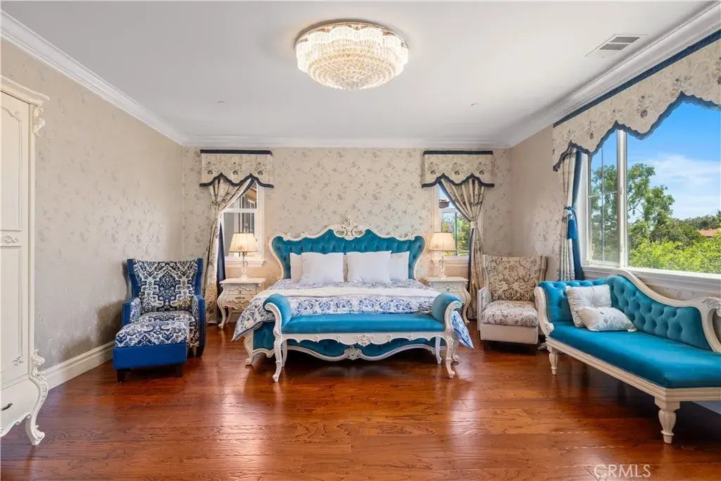 A rare opportunity to own a high-end, custom-designed estate home offering 5,142 square feet of refined luxury and grandeur. Every detail of this exquisite residence reflects the owners dedication and passion for quality living, with imported, custom-selected materials throughout. Even the solar power and water softening systems have been fully paid off, providing a high-quality, low-maintenance lifestyle. This thoughtfully crafted home features 4 spacious bedrooms, plus a separate guest suite with a private entranceideal for family members, long-term guests, or added privacy. Upon entry, youre welcomed by soaring ceilings and a grand imported crystal chandelier, creating an impressive and majestic ambiance. The formal dining and living areas are also adorned with imported crystal lighting, blending elegance with sophistication. The gourmet kitchen boasts an oversized island, a walk-in pantry, and expansive prep spaceperfect for both daily meals and entertaining. A fully equipped secondary kitchen adds convenience while keeping the main living areas smoke- and odor-free. The luxurious primary suite offers a peaceful private retreat, complete with a generous sitting area. Upstairs, a bright and expansive loft provides versatile space ideal for family gatherings, play, or relaxation. The outdoor areas are equally stunning, featuring a spacious private courtyard and a beautifully designed fountain, creating a tranquil and inviting environment. The three-car garage offers abundant parking and exceptional storage capacity. Located in a highly sought-after upscale community, this