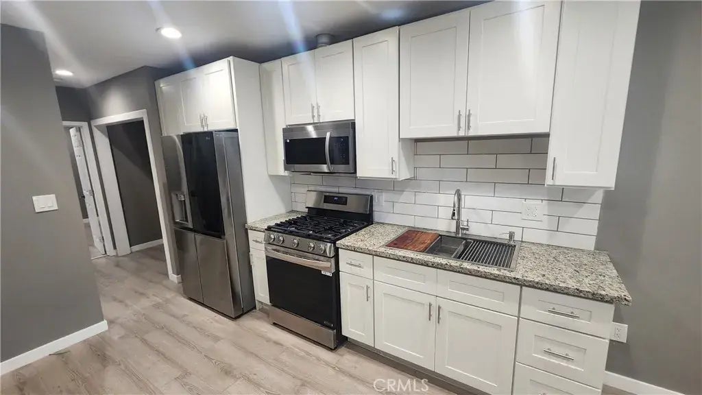 Discover a stunning 3-bedroom, 2-bathroom apartment that perfectly blends modern style with functional design. This freshly renovated unit is ready for lease and offers a sophisticated and comfortable living experience. The heart of the apartment is a sleek, open-concept kitchen featuring brand-new white shaker-style cabinets, elegant granite countertops, and a subway tile backsplash. It comes fully equipped with a suite of new stainless steel appliances, including an LG side-by-side refrigerator, a gas range with a center griddle, and a built-in microwave. The apartment's luxurious feel extends to the two full bathrooms, each featuring chic, dark blue vanities, modern fixtures, and undermount sinks. The master bath boasts a spacious walk-in shower with sleek tiling and built-in shelves. Throughout the space, you'll find beautiful, durable wood-look laminate flooring and recessed lighting that creates a bright, inviting atmosphere. For your convenience, the apartment includes a dedicated laundry closet with washer and dryer hookups and a tankless water heater for energy-efficient, on-demand hot water. Stay comfortable year-round with a high-efficiency mini-split AC system. The property also features a welcoming exterior with a covered porch area. This home offers the ideal combination of style, convenience, and modern amenities, making it a perfect choice for your next lease. Contact us today to schedule a viewing!