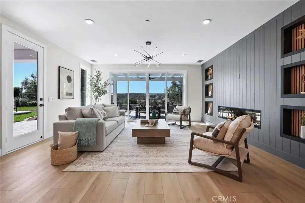 Welcome to this completely remodeled residence, where timeless architecture meets modern sophistication and breathtaking canyon and hillside views. The exterior captivates with stone accents, manicured landscaping, and a private gated courtyard leading to the entry. A three-car garage and classic clay tile roof add to the homes striking curb appeal. Inside, soaring ceilings and expansive windows fill the living areas with natural light. The open concept living room features a sleek fireplace, while the formal dining room is enhanced by a designer chandelier and seamless access to the backyard. The chefs kitchen is a true centerpiece, showcasing a large island, premium stainless-steel appliances, and custom cabinetry. A secondary prep kitchen adds convenience for entertaining. The family room highlights a modern linear fireplace with illuminated niches and sliding doors that frame sweeping canyon views. The home also offers a downstairs office and an en-suite bedroom ideal for guests or multi-generational living. Upstairs, a versatile loft provides a second living area, while two additional bedrooms include private en-suite baths. The primary suite is a sanctuary of comfort and sophistication. A spacious bedroom with accent panel wall and tray ceilings flows seamlessly into the luxurious spa-inspired bathroom. Here youll find a freestanding soaking tub, glass-enclosed shower with multiple rain showerheads, and a sleek dual vanity with LED mirrors. A cozy sitting area with its own fireplace enhances the retreat, while a private balcony captures sweeping hillside views. The ba