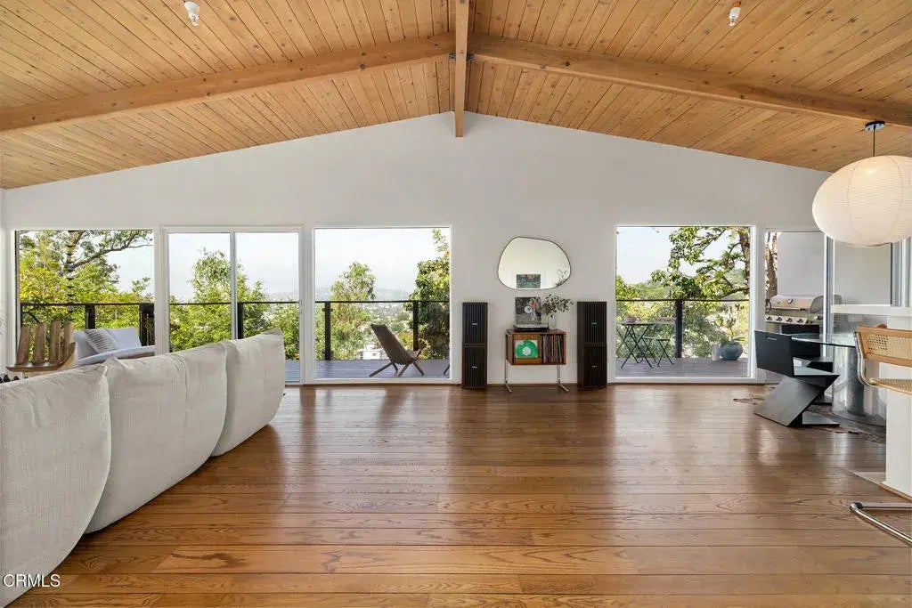 Discover a pristine mid-century modern home, circa 1960, perched in the historic Garvanza neighborhood, situated above Highland Park with stunning views. This thoughtfully crafted residence features four spacious bedrooms and three well-appointed bathrooms, including a master suite with a steam shower, soaking tub, and walk-in closet. Enjoy the luxury of a custom dry sauna for added relaxation.Emphasizing natural light and scenic vistas, the open design includes floor-to-ceiling windows and balconies that enhance the living spaces. The cook's kitchen equipped with high end appliances seamlessly connects to the dining and living areas, making it perfect for entertaining. Elegant hardwood floors and exposed beams create the framework for quintessential Los Angeles living.The first level offers two bedrooms, one with an en suite bathroom, alongside a convenient powder room. The lower level includes two additional generous bedrooms, each with its own en suite bathroom, ensuring privacy and comfort. A functional laundry area adds to the home's convenience, along with an attached two-car garage and additional flex space beneath the property.Step outside to a terraced, private yard shaded by mature trees, ideal for enjoying a quiet moment or outdoor activities. With 2,132 square feet of well designed living space, this special property presents a unique opportunity to escape the hustle and bustle of the city, yet remains just a stone's throw away from Highland Park's vibrant high streets, hiking trails, art studios, and some of the best shops and restaurants in the area. This peac