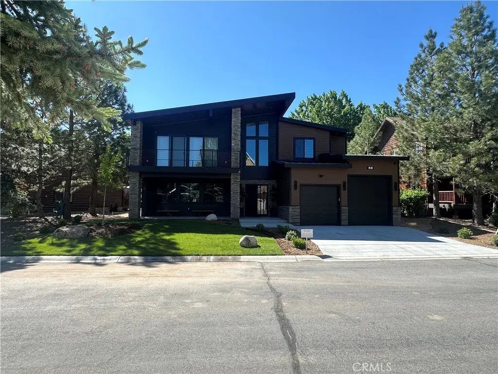 DISCOVER THE ULTIMATE RETREAT IN THIS BRAND NEW RUSTIC CONTEMPORARY HOME, COMPLETE WITH MODERN AMENITIES, SITUATED IN THE EXCLUSIVE GATED COMMUNITY OF EAGLES KNOLL ~ Conveniently located to all that Big Bear has to offer, this home is across the street from the lake and the community offers a private marina, common tennis court, and community park ~ Quality construction and well-designed open floor plan w/ loads of upgrades including air conditioning & smart home controls ~ The upscale kitchen is a chef's delight, equipped w/ high end Decor appliances (fridge, stove, dishwasher, range, microwave & wine dispenser) & a spacious center island for entertaining ~ The adjacent dining area creates a perfect setting for intimate meals ~ Step outside through the large folding doors, allowing the crisp mountain air to flow throughout the home, bringing the outdoors in, hosting gatherings, & enjoying the built-in bbq w/ friends & family ~ The expansive living room features tall ceilings & a gas fireplace, creating a cozy yet spacious ambiance ~ The large game room upstairs, complete w/ a bar & massive sliding glass door, provides an additional space for entertainment & relaxation ~ Fire sprinklers included for added safety & energy-saving solar panels (leased) ~ Level entry oversized 2-car garage, featuring electrical wiring for EV charging, tall ceilings, & a garage door suitable for boat storage ~ Come view this beautiful home!