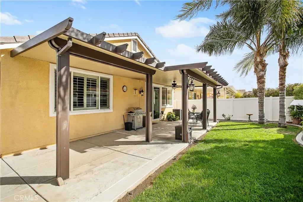 Beautiful, move-in ready home in the 55+ gated community of Orchid at Pacific Menifee. This single-story home on an interior cul-de-sac street features 2 bedrooms, a den/office, and 2 full bathrooms. The remodeled front yard includes an expanded porch area, an enlarged driveway for 3 vehicles, a raised brick planter, artificial turf, stone pavers, and electrical outlets under the eaves for convenient outdoor lighting use. Inside youll love the high ceilings, window shutters, quartz countertops, ceiling fans, and engineered hardwood floors throughout with carpet reserved for both bedrooms. At the heart of this home is a chefs delight kitchen. Featuring stainless steel appliances, loads of cabinet and counter space, endless quartz countertops, and a massive kitchen island with breakfast bar seating. This kitchen flows seamlessly into the dining area and a large family room for an open concept feel. A gas fireplace and custom media built-in anchor this space well. The primary suite includes a walk-in shower, soaker tub, dual sink vanity, and a spacious walk-in closet. The secondary bedroom includes mirrored closet doors and plenty of space. An inside laundry room with sink and additional storage, plus a whole house water softener system is also nice. In the rear yard youll find the perfect blend of stamped concrete, lush green grass, low maintenance plants, and a full-length aluminum patio cover providing shelter as you enjoy this tranquil retreat. Outdoor lantern sconces and a ceiling fan elegantly illuminate the nights. Its the best yard to unwind and relax. White vinyl fenc