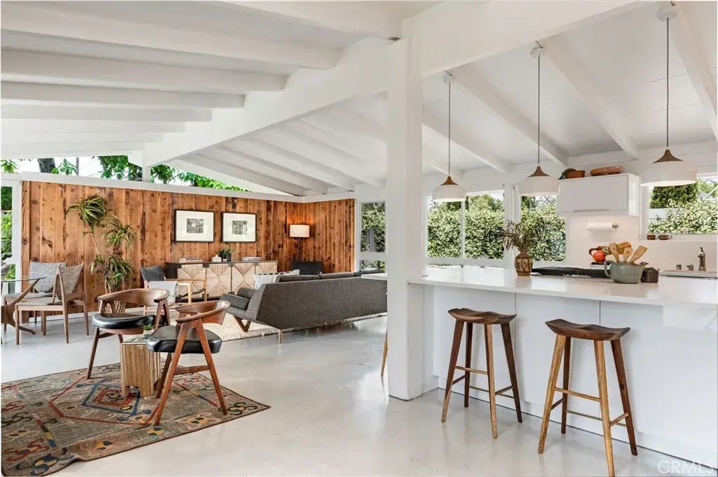 The Rancho Estates Plan 4A is the largest of the original Cliff May designed floor plans, offering more living area than other original models, and more lot space. With more area in which to live, work, and entertain, this model is ideal for embracing the indoor-outdoor lifestyle that defines this iconic midcentury modern community. This thoughtfully renovated 3-bedroom, 2-bathroom home blends timeless design with modern convenience. Signature Cliff May features include post-and-beam construction, floor-to-ceiling glass, open beam ceilings, and clerestory windows that flood the interior with natural light while maintaining privacy. The layout centers around a large private courtyard that connects seamlessly with the interior spaces and is ideal for al fresco dining, relaxing, and entertaining. Updated in 2021, the home features polished concrete floors, a spacious island kitchen with quartz countertops, custom cabinetry, and a lighted pantry. The primary and guest bathrooms have been fully remodeled with contemporary finishes, and a full set of dual-pane Cliff May-style replica windows and doors preserves the architectural character while improving energy efficiency and year-round comfort. Additional improvements include an upgraded HVAC system, newer composition shingle roof, and low maintenance landscaping with automatic irrigation. The property sits in a quiet location in the Rancho Estates, a neighborhood celebrated for its Cliff May architecture, tree-lined streets, strong sense of community, and proximity to the 800-acre El Dorado Park and Nature Center. Located on th