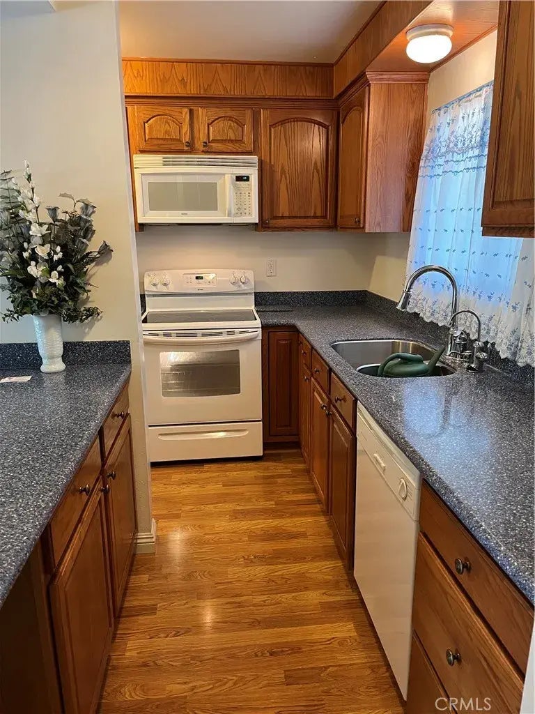Extra privacy, great end location, attached neighbor on only one side. View from primary bedroom balcony of grass courtyard (with fountain) and beautiful shade tree. Large patio connects directly to double car enclosed garage. Upgraded then well cared for home: windows, sliding door, downstairs flooring. Kitchen upgrades include the cabinets, appliances, countertops. Both bathrooms updated. New flooring upstairs, freshly painted throughout. Very clean turnkey home in desirable Rossmoor neighborhood. Highly sought after Los Alamitos School District.