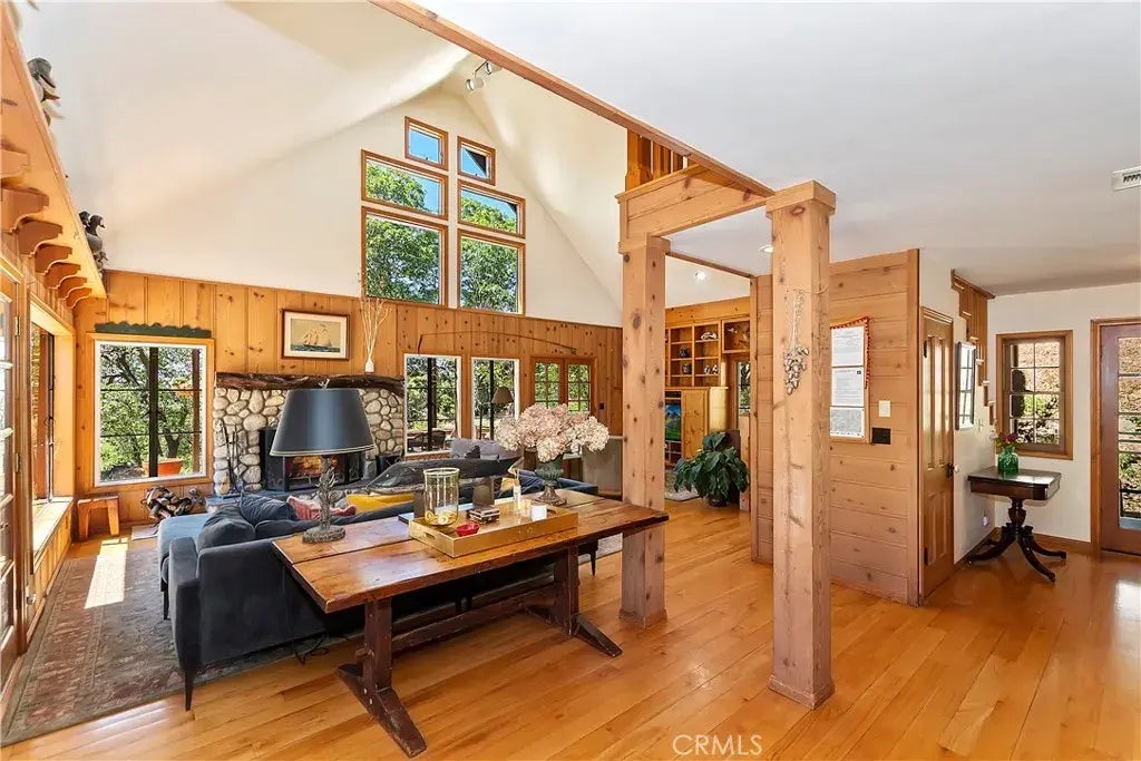 Imagine strolling through your 2.9 acre parcel; blanketed within a canopy of mature Oak Trees, a variety of apple trees, and wildflowers throughout. Breathtaking views of the Northern Pinnacle rock formations. A pathway winding through the forest leads to your private swimming pool with slate sunbathing deck, and croquet area. Horses rest in their stables just beyond the secluded pool. Enjoy relaxing evenings, creating memories with family and friends on a massive wrap around rear deck overlooking the grounds. Winter holidays cozied up next to the stone fireplace which rests in a spacious open concept living room with two story cathedral ceiling. Living room offers wrap around windows, hardwood flooring, built in bookcases, and level entry out to the rear deck. Updated kitchen open to the living room complete with solid surface counters, farm house sink, and stainless appliances. This 3,052 sq ft ranch house features 4 bedrooms, 3.5 baths. Primary bedroom en suite, laundry room, kitchen and living room all conveniently located on the main level. Level entry from front door and garage entryways. Upstairs offers 3 guest bedrooms(one being en suite with bath attached) and a home office. Level driveway provides plenty of room for multiple guest and boat parking. Full lake rights to private Lake Arrowhead and zoned equestrian. There's an equestrian easement which allows you to ride directly from the stables into the National Forest. Off road vehicle enthusiast? Ride straight from the property and connect to miles of single track ATV & mountain bike trails. Property includes its