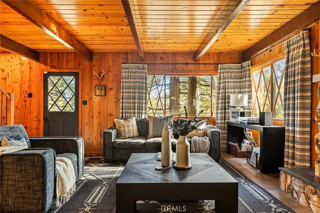 Nestled in the heart of Lake Arrowhead's picturesque Alpine community, this charming Mountain-Modern cabin is a perfect blend of rustic appeal and modern convenience, offering an ideal retreat for mountain living. Located on a serene, wooded lot across from the Lake Arrowhead Country Club golf course, this home provides both tranquility & easy access to the areas most coveted amenities. Lake Arrowhead is a lifestyle destination, offering residents unparalleled access to its pristine private lake. As a homeowner, youll enjoy privileges such as entry to three members-only beach clubs and the opportunity to launch sailboats, ski boats, deck boats, pontoon boats, kayaks, canoes, and paddleboards. Whether youre seeking outdoor adventures or peaceful relaxation, this community has something for everyone. From the moment you arrive, this property impresses with its timeless mountain aesthetic and thoughtful design. Again, this home boasts recent "Mountain Modern" upgrades, including a stunning, high-end kitchen that perfectly blends form and function. The open floor plan ensures seamless living, with a large dining area and a cozy living room featuring a stone fireplace, making it the ideal space for gathering with family and friends. The primary retreat is a true sanctuary, featuring a private deck, a gorgeous fireplace, & open-beamed vaulted ceilings that create a sense of spaciousness and rustic elegance. Two additional well-appointed bedrooms and two baths offer plenty of space for guests or family members, while the expansive family room provides a versatile area for entertai