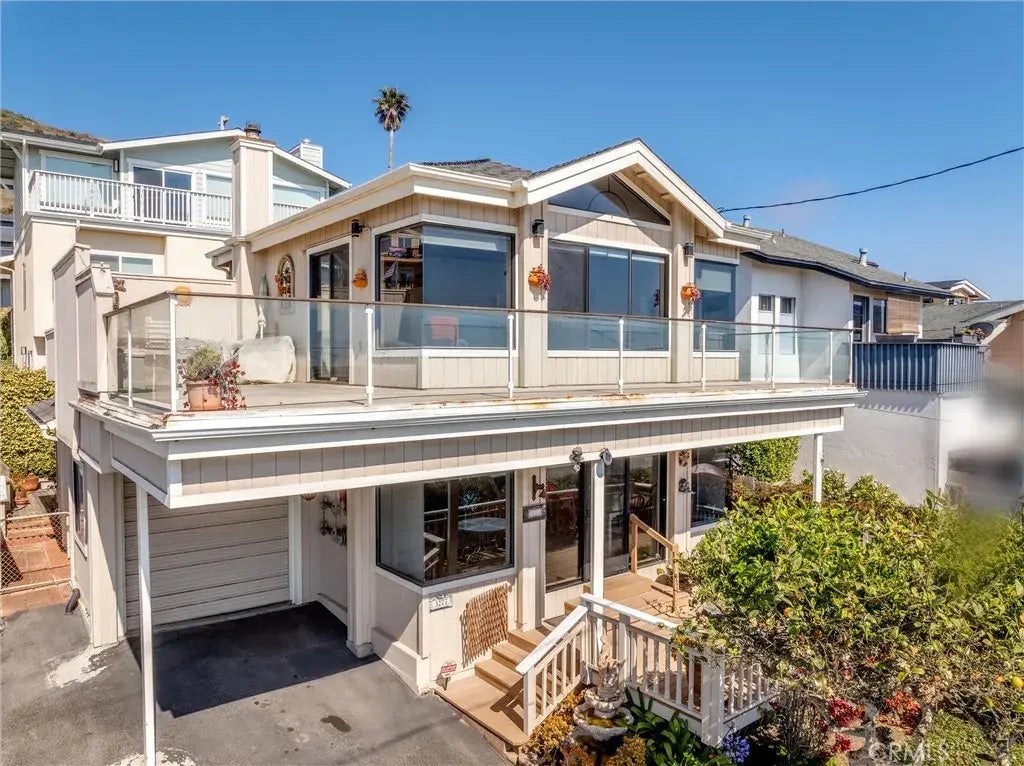 Vibrant Coastal Living with Expansive Views. This unique upslope property offers a rare combination of versatile living space and captivating Pacific Ocean vistas. Thoughtfully designed on two levels, the home maximizes natural light and views with extensive windows and multiple view decks. The lower level features a well-appointed kitchen with quality appliances, solid surface countertops, fine cabinetry, and tile flooring. Adjacent are the dining area, two comfortable bedrooms, a 3/4 bath, and access to a sheltered rear patioideal for indoor-outdoor coastal living. Upstairs, the spacious primary suite impresses with open beam ceilings, a private 3/4 bath, and a large deck showcasing panoramic ocean views. Additional highlights include an attached garage plus extra off-street parking. The property benefits from a unique setting across from lower-elevation land and an unused street, preserving future view corridors. Perfect as a full-time residence or a weekend retreat, this home combines location, design, and qualityoffering a rare opportunity along this coveted stretch of coast.