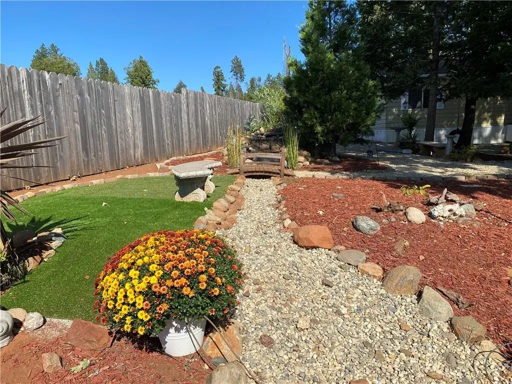 Charming Magalia Home in Paradise Pines! Dont miss this affordable opportunity for homeownership in a desirable cul-de-sac setting within the Paradise Pines HOA, offering access to a pool, clubhouse, sport courts, hiking trails, and more! This inviting 2-bedroom, 2-bathroom home spans 1,440 SqFt on a .27-acre parcel with fresh landscaping that includes a peaceful creek bed and waterfall feature. Step inside to find a large living room plus a separate, spacious family room with a cozy woodstove that opens to the kitchen, featuring abundant cabinetry and newer counters. The primary suite includes a generously sized bathroom with both a tub and shower. The guest bedroom offers convenient access to a continental bath with a full-size shower. Enjoy the oversized covered deck with neighborhood views, perfect for relaxing or entertaining. Additional highlights include a laundry room with extra storage, a bonus storage area, and a HUGE detached shed for all your hobbies or projects. This home combines comfort, function, and community amenitiescome see it today!