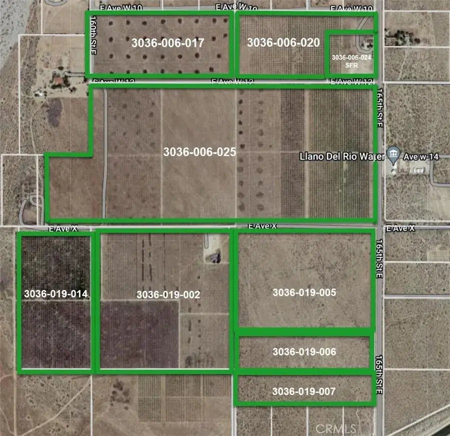 Nestled in the heart of the fertile landscapes of the Crystalaire area of Llano, California, this expansive portfolio of land presents a rare chance to cultivate your dreams. Zoned for agriculture. All nine parcels together total approximately 234.36 acres consisting of APNs 3036-019-005, 3036-019-006, 3036-019-007, 3036-019-002, 3036-019-014, 3036-006-017, 3036-006-024, 3036-006-025, and 3036-006-020. Located near local amenities and with easy access to major roads, these lots strike the perfect balance between rural seclusion and urban convenience. Properties can be acquired separately in any combination, or better yet, submit an offer on all of them and begin or expand your land empire in the Antelope Valley, however, Seller will not consider offers on the parcel with the dilapidated home which does not include a concurrent offer and closing on all or a significant portion of the surrounding parcels.