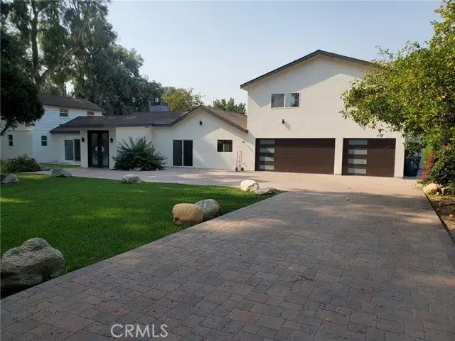 Contemporary paradise on just under an acre. This gated estate begins with an extended paver driveway leading through the peaceful, relaxing front yard. The home is mostly on one level, except for two newly built bedrooms with en-suite baths, a laundry room, and a bonus room. The first floor features an expansive open floor plan with a modern kitchen featuring a center island, dining area, formal living area, TV lounge area, and two master suites with en-suite baths. All bathrooms have been renovated in a contemporary style. The great room and master suite flow into the backyard with a large pool and spa. The 2-bedroom-bath guest house has a kitchen, including a dishwasher.