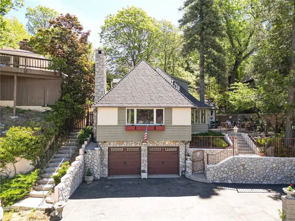 Lake Arrowheads finest vintage cottage with lake rights! Filtered lake views seasonally. Come live the lake dream life in this vintage cottage a 3 minute walk to the lake. This slower paced life with so many fun activities. Skypark at Santa's Village, Lake Arrowhead Village with seasonal concerts and functions, Fishing tournaments and great shopping and restaurants. Every nook and cranny says craftsmanship, character it's simply oozing with charm! 2 car attached garage with an adjacent storage room, perfect for storing your ski and boat gear. Lots of additional flat parking enough for 5 cars and RV or boat storage. The gardens are so peaceful and lovingly cared for, mature trees and landscaping on a brick patio. You will fall in love the minute you arrive, a covered entrance leads to a dutch door and then wow! This vintage cottage has the most magnificent wood beamed coffered ceilings and spectacular stone statement fireplace with substantial mantle and raised hearth. This fireplace is the heart of this home, flanked by built in bookcases and niches to display your treasures. The rich hardwood flooring in almost every room is the icing on the cake! Kitchen is great sized with lots of cabinetry and counter space. The cutest breakfast nook, surrounded by vintage shelving, windows and fine detailing. Primary Suite with attached 3/4 bath is downstairs, along with an additional full bathroom and walk in storage room. Upstairs you'll find 2 additional bedrooms and bathroom , cozy and well appointed. Large land area in rear yard that could be perfect to build a patio/deck/addition