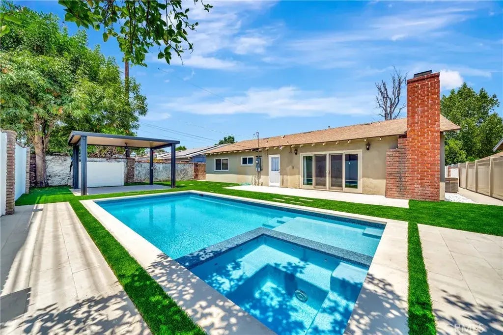 Welcome to Hartland The Heart of West Hills! Discover this beautifully upgraded, one-story home in the highly desirable West Hills area, situated on a spacious, flat lot and driveway. Key Features & Upgrades: New electrical panel, newer roof, brand-new sewer line, and water heater offering peace of mind. Bright, open layout with LVP flooring throughout. Cozy fireplace elegantly separating living and family rooms. Completely remodeled kitchen with quartz countertops, island/bar, subway tile backsplash, stainless steel appliances with custom hood, and custom cabinetry. French doors leading from the living area to the private backyard. Bedrooms & Bathrooms: Generously sized bedrooms, perfect for families, guests, or a home office. Updated bathrooms, including a floor-to-ceiling tiled shower and secondary bathroom with tub and stylish tile accents. Outdoor Living: Well-maintained backyard with covered patio, grassy area, and fruit trees. New construction pool and spa with cabana, including a pool heater ideal for relaxation and entertaining. Set on a picturesque, tree-lined street with excellent curb appeal, this move-in-ready home combines modern upgrades, functional living spaces.. Homes like this are rare dont miss your chance to call Hartland home! **The property has a separate ADU that is currently rented, with privet entrance from the side of the house.