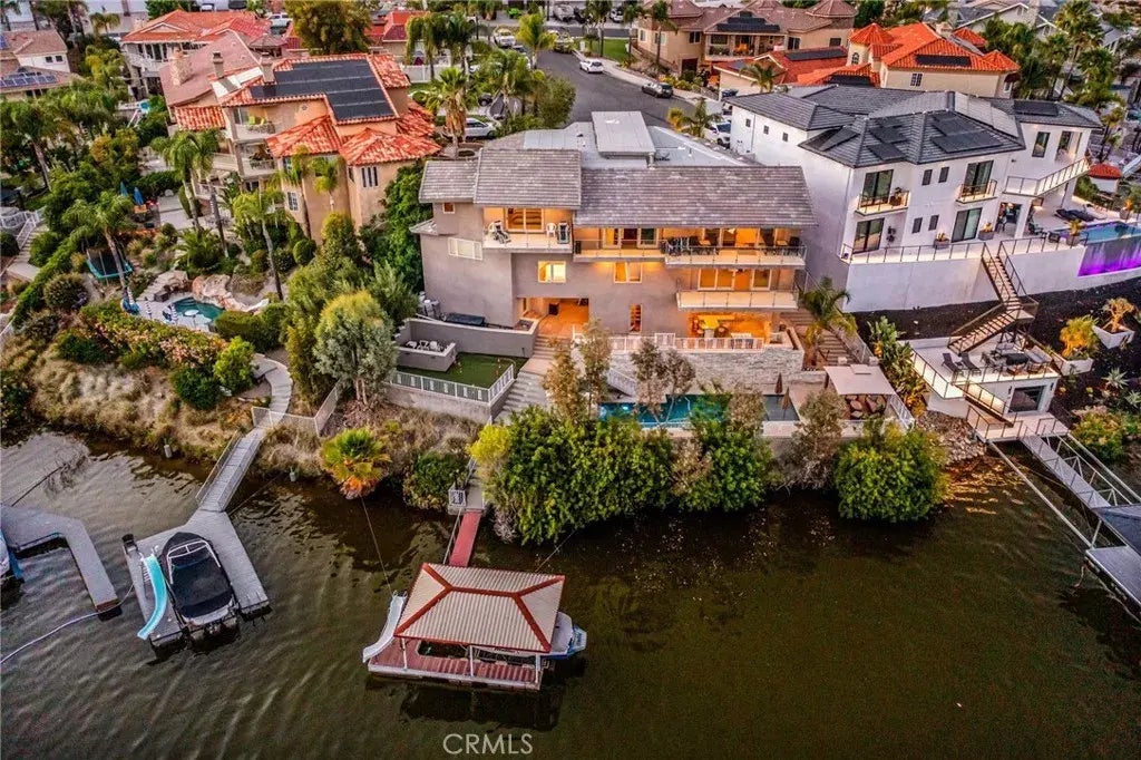 Experience contemporary waterfront living at its finest in this stunning 5,171 sq. ft. home, perfectly positioned on a premium -acre main lake lot offering some of the most panoramic views in the entire community. From the moment you enter through the grand 10-foot solid mahogany door with stainless steel accents, you're welcomed by a dramatic foyer and a breathtaking wall of windows framing unobstructed views of the lake, beach, and surrounding hills. The main level offers an expansive open-concept design ideal for entertaining, with elegant lighting fixtures, chandeliers, blackout shades, and a built-in bar complete with a dumbwaiter to the lower level. Enjoy multiple flexible living areas for dining, relaxing, games, and media, all enhanced by a floor-to-ceiling stacked stone fireplace and a central theatre-quality whole-home audio and intercom system. The chefs kitchen boasts custom hardwood cabinetry, quartz countertops, stainless steel appliances, and abundant storage. Two bedrooms and two full bathrooms complete the main level, along with a nearly full-width deckperfect for taking in breathtaking SoCal sunrises and sunsets. The mid level hosts the luxurious primary suite with lake views directly from bed, oversized sliders opening to a private balcony, and a spa-like bath with dual vanities, soaking tub, walk-in shower with custom tile, and a spacious walk-in closet with built-ins. Two additional bedrooms with vaulted ceilings and walk-in closets offer more lake views, along with a full guest bath, a laundry room, and a versatile flex space currently used as an Escap