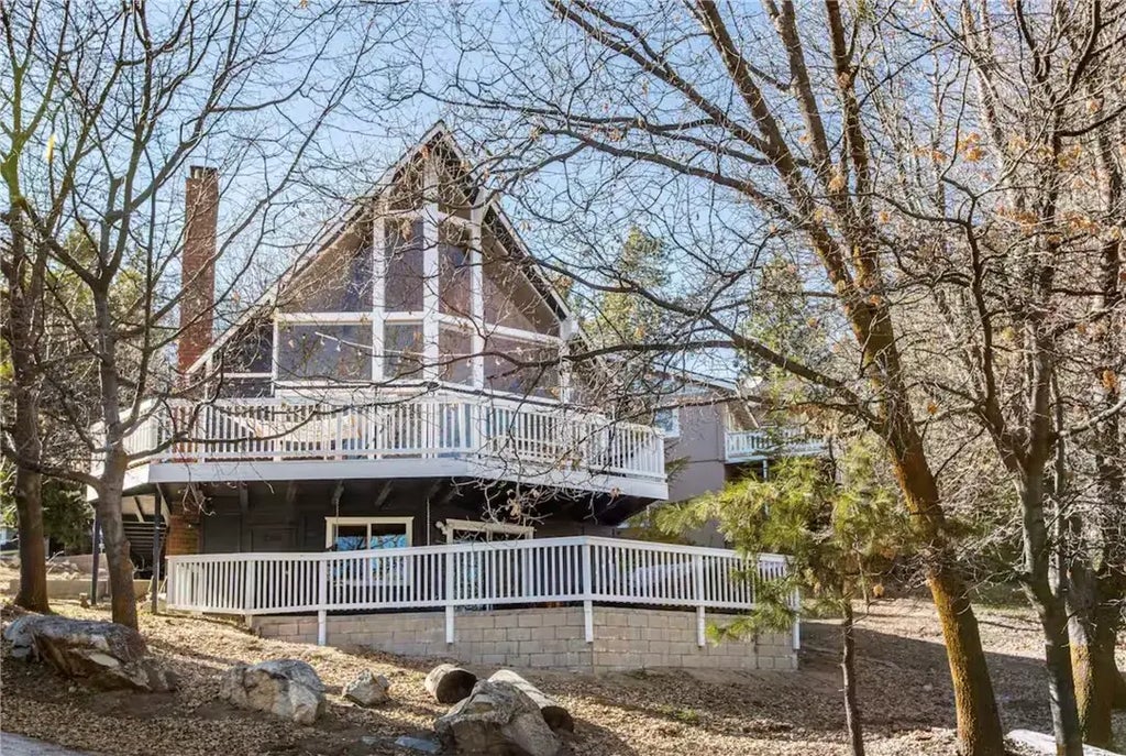 This beautiful A frame tri-level cabin is nestled on a quiet cul-de-sac, with level entry and LAKE RIGHTS. Upon entry be greeted by 30 foot ceilings with a wall of glass that looks out onto a wrap around deck. The property has been an active vacation rental for over 5 years with a phenomenal history of rental revenue. On the main level there are 2 bedrooms and a full sized bath. The kitchen has a large island accommodating seating for up to 8-10 with a mini refrigerator and plenty of space for cooking. The lower level 4th bedroom with bathroom en suite has a slider with entrance to a lower level deck with a hot tub and fire pit. Heading up to the 3rd level there is the master bedroom and another en suite bathroom. The main level and upper level both have mini split AC units. This lovely cabin sits on a nearly half acre lot with a horseshoe driveway large enough for 4-5 vehicles. The lower deck is fully enclosed for your furry friends. This cabin is truly stunning and has it all, a wall of windows, with level entry and ample parking. Conveniently located within a short drive to Lake Arrowhead Village and Tavern Bay.
