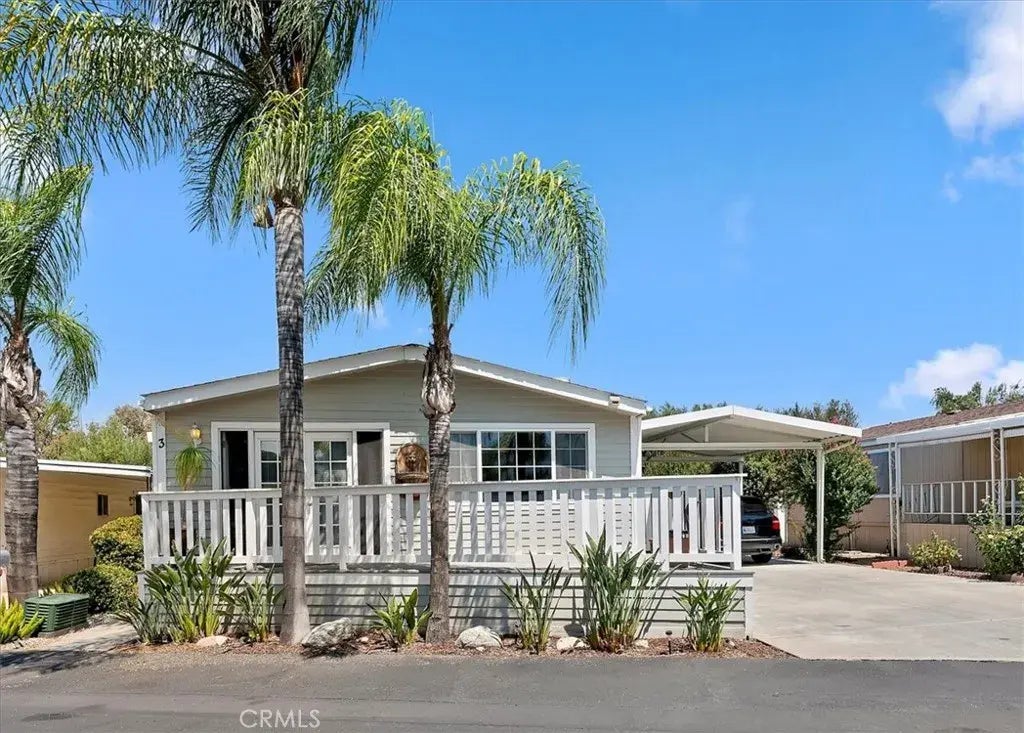 Wow! This beautifully maintained manufactured home is located in a desirable age-restricted community and offers both comfort and convenience. *Featuring 3 spacious bedrooms and 2 bathrooms, this home boasts a cozy fireplace in the living room, perfect for relaxing evenings. Step out onto the charming front deck through a stunning 10-pane door with side wingsideal for enjoying your morning coffee or evening breeze. For added convenience, the side entrance features a ramp for easy access. *The primary suite includes a large walk-in shower and double sinks, offering both space and functionality. A separate dining area with a built-in china hutch provides a formal touch, while the kitchen is enhanced by a breakfast bar that opens to the dining spacegreat for casual meals and entertaining. *Enjoy the convenience of a large indoor laundry room, complete with a bonus dishwasher, a cubby for a second refrigerator, and a built-in cabinet perfect for folding laundry. *One of the rare features in manufactured home communities is the spacious carport, allowing side-by-side parkingno more juggling vehicles! *The location is just as impressivesteps away from the community pool and clubhouse, and directly across from a lovely palm tree park, offering privacy with no front-facing neighbors. Inside, the home is light, bright, and filled with ample storage throughout. *With easy access to the 15 freeway, this home combines serene community living with unbeatable convenience.