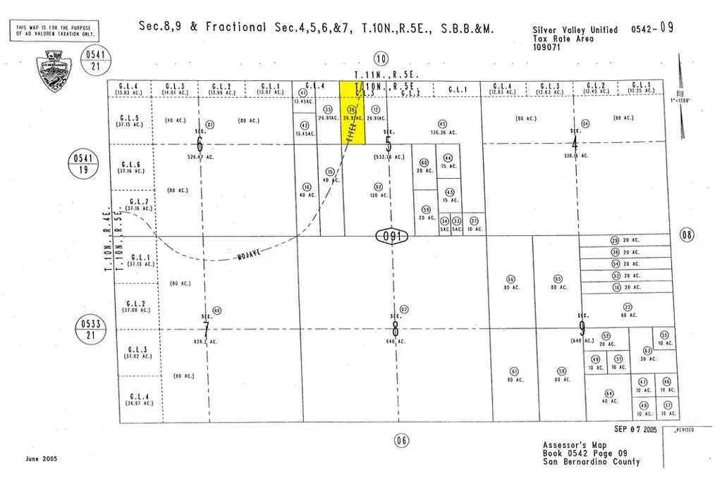 Discover 26.91 acres of vacant land ideally situated off I-15 near the Mojave River between Newberry Springs and Baker. This expansive parcel offers excellent accessibility from both the I-15 and I-40 (Needles) Freeways, making it a convenient and strategic location for a variety of potential uses. Enjoy the peace and open desert views while being close to major travel routes. Buyer to verify use and availability of utilities. Great investment opportunity for future development or a desert retreat getaway in the growing Yermo area! ****No soils reports, surveys, etc., have been done. Buyer and buyer's agent to verify all information with the city or county for allowable uses and requirements and rely on their own investigations. **Buyer responsible for checking zoning, utilities, permits and exact property boundaries. ****