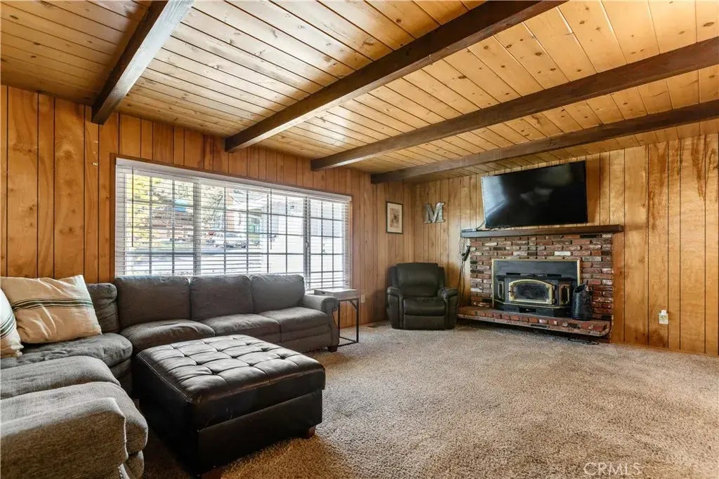 Welcome to the serene community of Wrightwood, where this beautiful home at 784 Apple Ave awaits you. Spanning 2,162 sq ft, this residence features 3 spacious bedrooms and 2 bathrooms, ideal for comfortable living. As you enter, you are greeted by an inviting living room with wood beamed ceilings that create cabin atmosphere in the home. The cozy fireplace serves as a central focal point, radiating warmth throughout the main living areas. Adjacent to the living room, you'll find an open dining area and family room, perfect for family gatherings. The kitchen is equipped with complete appliances, including, dishwasher, oven, range and refrigerator. The home's thoughtful layout includes two bedrooms located a few stairs up on the upper level, complemented by a shared full bath, creating a private retreat for family or guests. The downstairs area boasts easy access to the backyard and includes a spacious bedroom suite, offering privacy and comfort. Step outside to discover a fully fenced backyard with beautiful landscaping, mature trees including an apple tree. An extra-large storage shed, providing both beauty and functionality. Dual Pane windows throughout the home for energy efficient summers and winters. Central AC and Heat with additional heat source with the fireplace wood burning insert. New roof installed and septic tank installed 2022. This property features a detached 2-car garage, accessible from the front deck or backyard, with a convenient U-shaped driveway for hassle-free parking. In garage EV Charger for electric or hybrid vehicles. Situated just minutes from dow